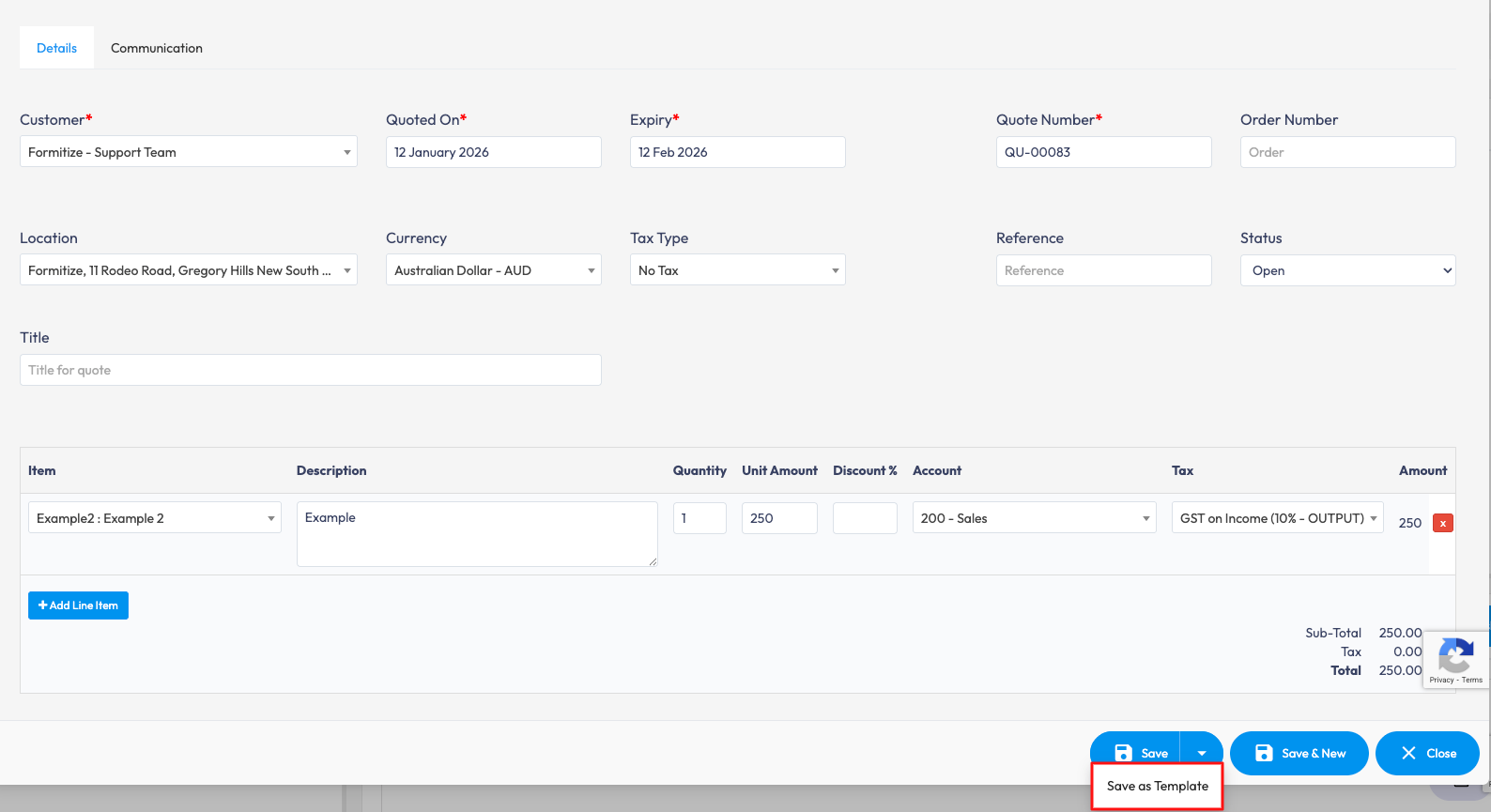 Once a new Quote has been created, you will have the option to Save as Template. When saving a Quote as a template, all quote content is stored except variable details such as Customer, Location, Quote Date, Due Date, and Quote Number.