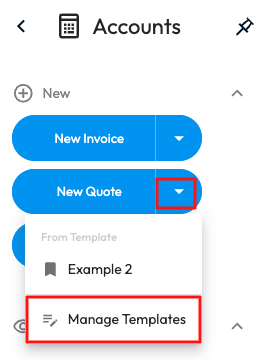 Quote Templates can be managed through the Accounts menu > select the dropdown next to New Quote > select an existing template to view the details or manage templates to delete those that are no longer needed.